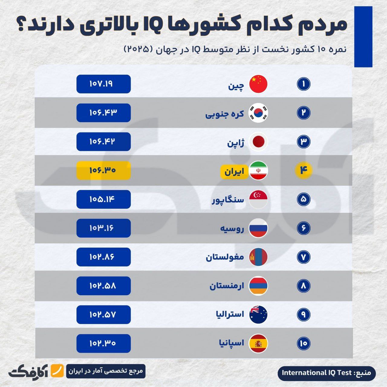 ۱۰ کشور برتر جهان از نظر میانگین IQ در سال ۲۰۲۵