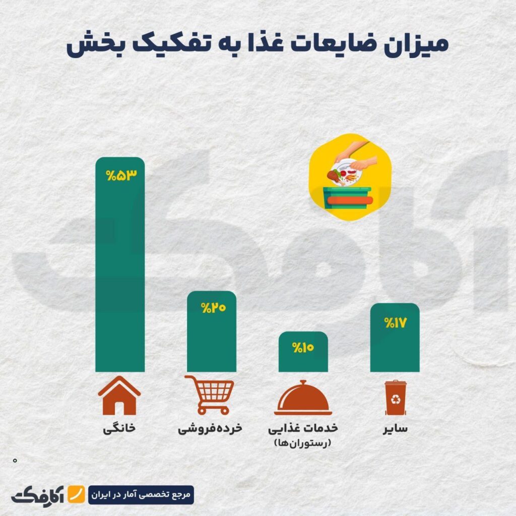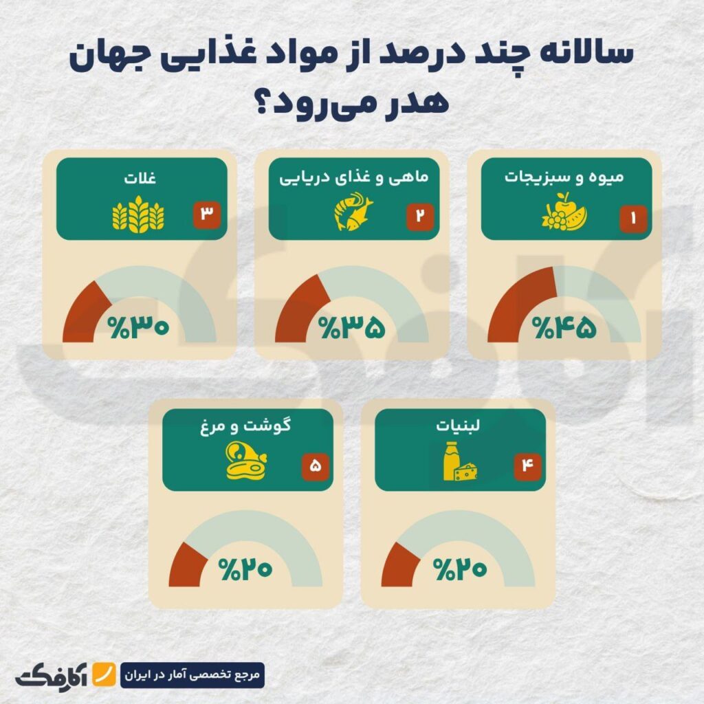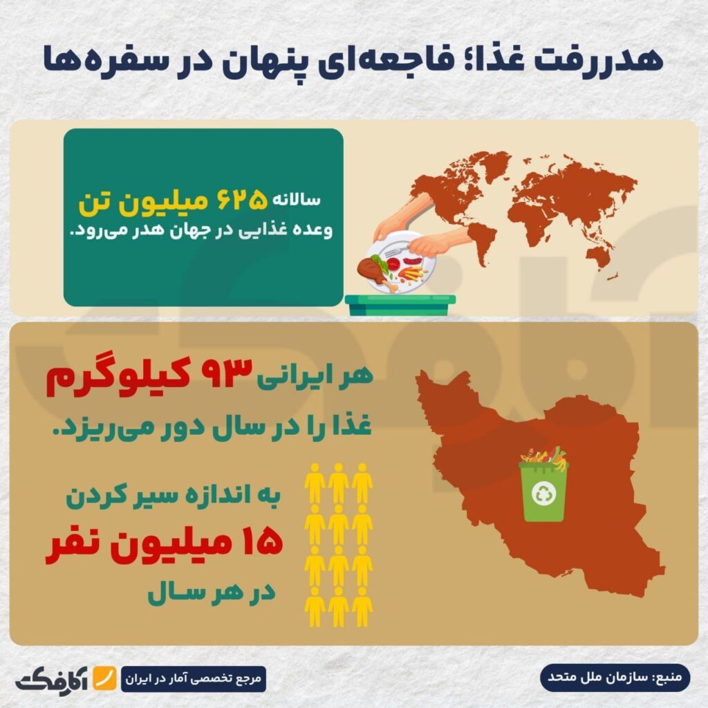 همچنین طبق برآوردهای اولیه با حجم غذای از بین رفته در ایران میتوان تغذیه ۱۵ میلیون نفر را در سال تامین کرد. آمارهای منتشرشده رسمی در سال ۲۰۲۵ نشاندهنده آن است که هر ایرانی به طور متوسط ۹۳ کیلوگرم غذا دور ریخته است.