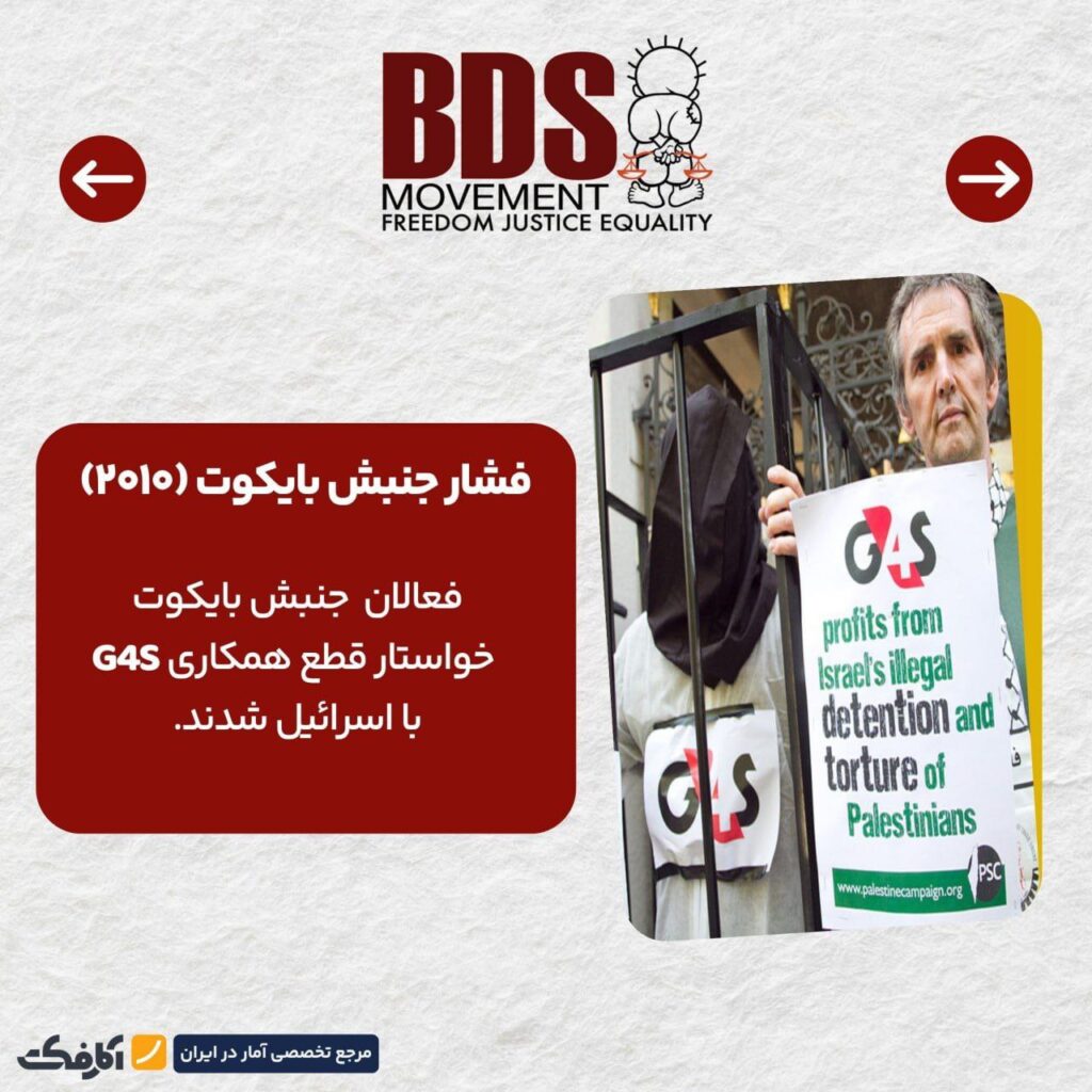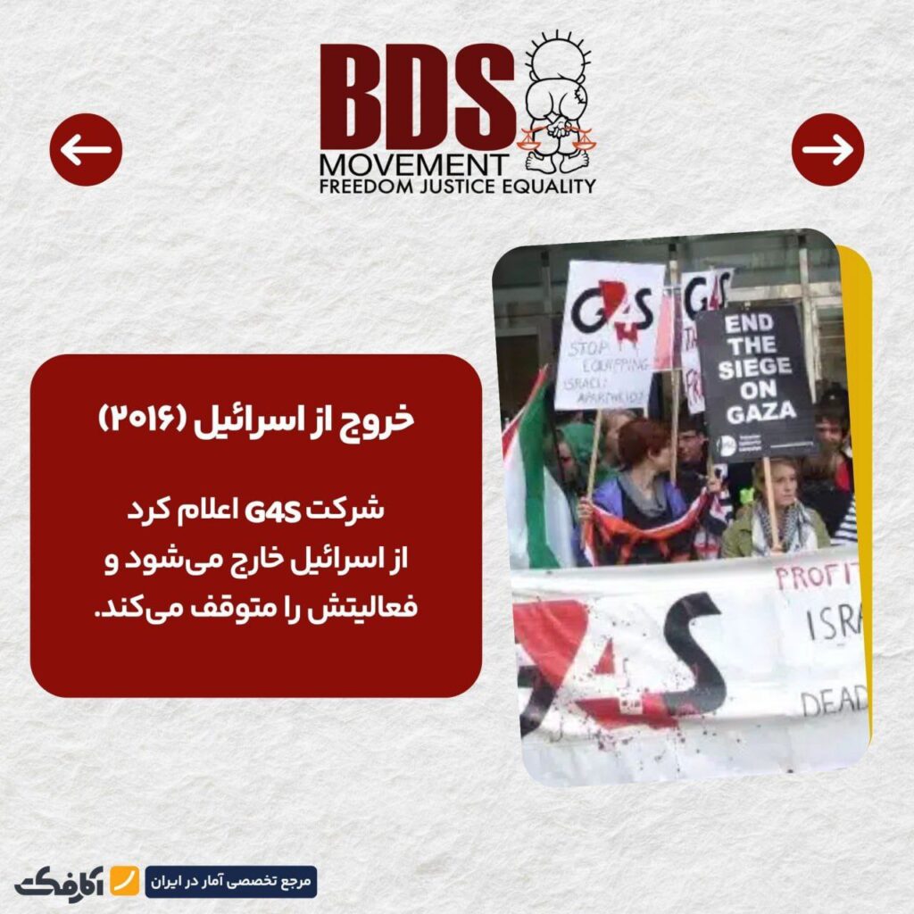 در سال ۲۰۱۶، G4S بهدلیل این تحریمها از اسرائیل خارج شد و نمونه موفقیت بایکوتها شد.