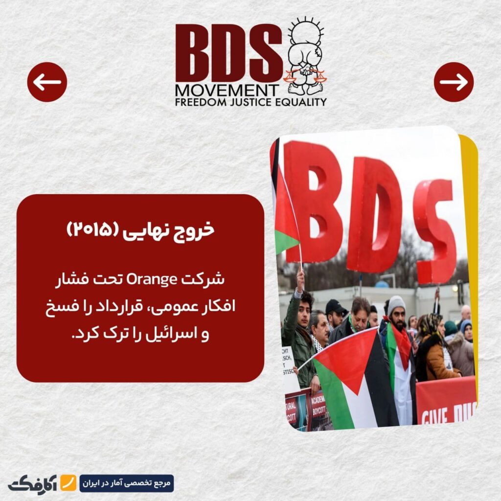 پس از افشاگری جنبش بایکوت از اقدامات این شرکت و فشار افکار عمومی جهان بر شرکت Orange، نهایتاً Orange قراردادهای خود با اسرائیل را فسخ کرد.