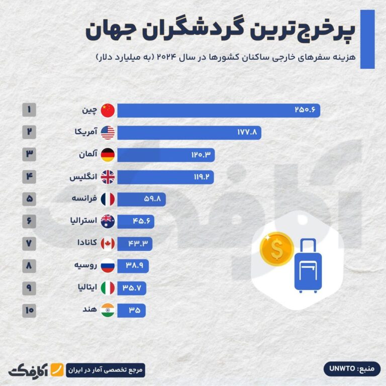 چینیها با حدود ۲۵۰ میلیارد دلار در صدر بیشترین هزینهکرد گردشگری خارجی قرار دارند و پس از آن آمریکاییها با ۱۷۸ میلیارد دلار و آلمانیها با نزدیک به ۱۲۰ میلیارد دلار جایگاههای بعدی را گرفتهاند.