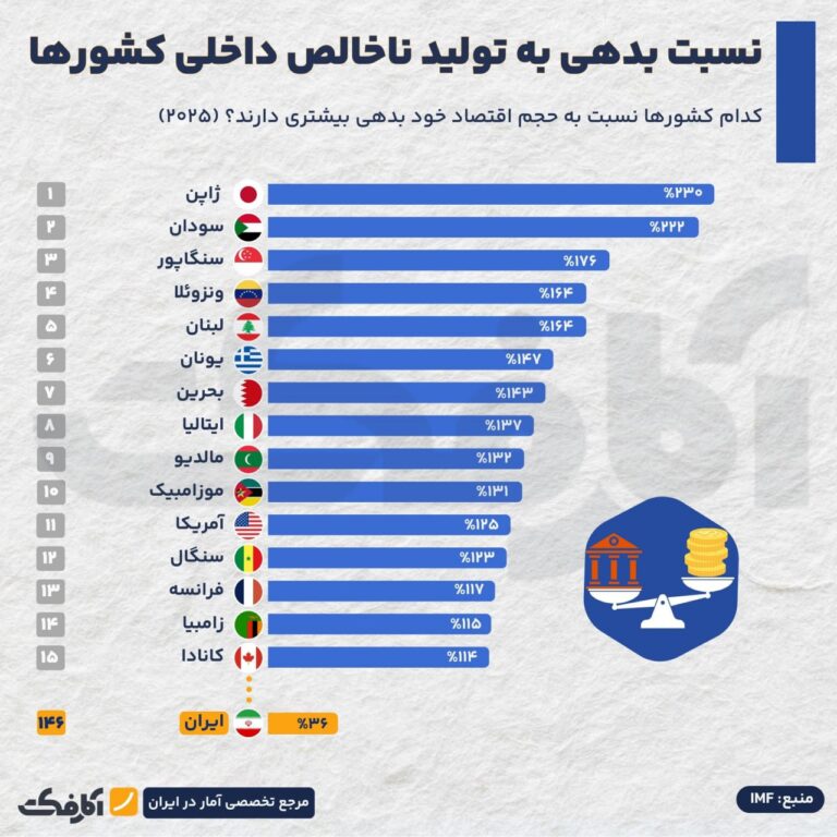 ژاپن با ۲۳۰٪، سودان با ۲۲۲٪ و سنگاپور با ۱۷۶٪ بیشترین نسبت بدهی به تولید ناخالص داخلی (GDP) را در سال ۲۰۲۵ دارند.