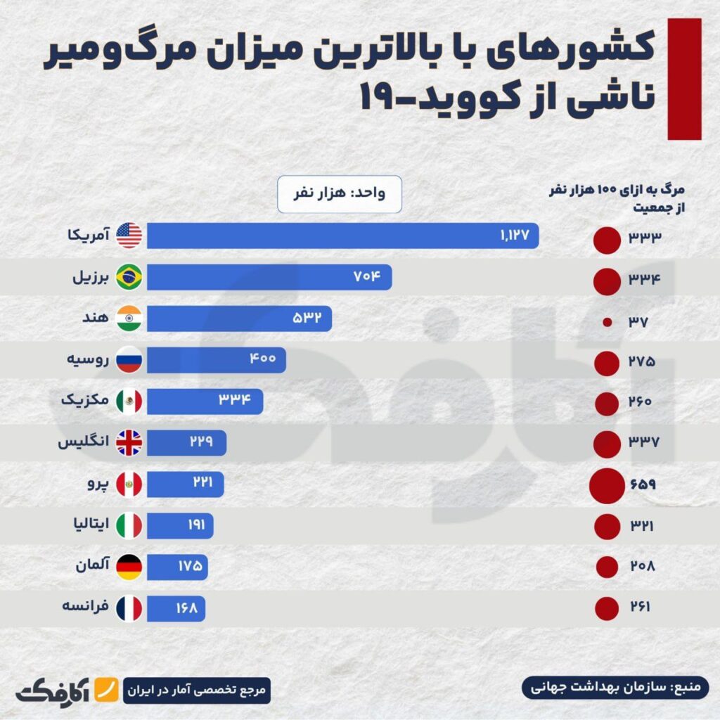 ایران با حدود ۱۴۷ هزار مرگ ناشی از COVID‑19، در رتبه دوازدهم از نظر تعداد مرگها و از نظر نسبت مرگومیر به جمعیت در رتبه ۶۹ جهان قرار دارد.