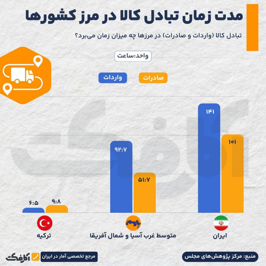 زمان ترخیص کالا در مرزهای ایران نسبت به ترکیه و متوسط منطقه به طور قابلتوجهی بیشتر است؛ واردات ۱۴۱ ساعت و صادرات ۱۰۱ ساعت طول میکشد.