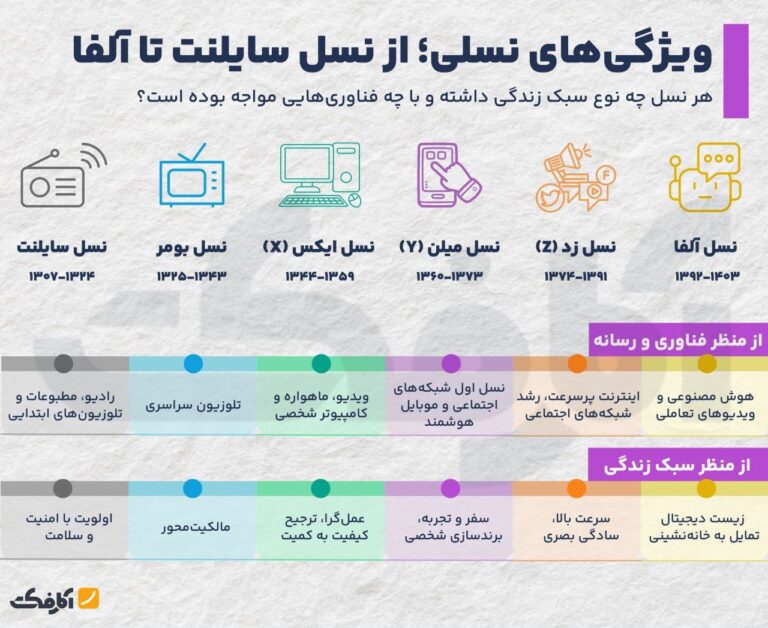 تحولات نسلی نشان میدهد که هر دوره با رسانه و فناوریِ خاص خود شکل گرفته است؛ از رادیو و تلویزیون در نسلهای قدیمیتر تا اینترنت، موبایل و اکنون هوش مصنوعی در نسلهای جدید.