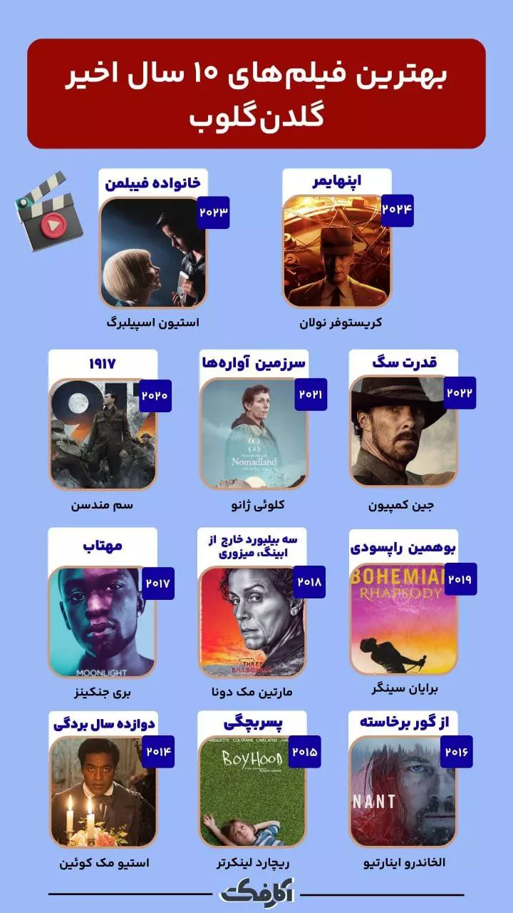 این تصویر فهرستی از بهترین فیلمهای ده سال اخیر گلدن گلوب را نمایش میدهد. هر سال یک فیلم به عنوان برنده جایزه بهترین فیلم درام انتخاب شده است. بررسی این لیست نشان میدهد که فیلمهای متنوعی از ژانرهای مختلف توانستهاند این جایزه را کسب کنند.