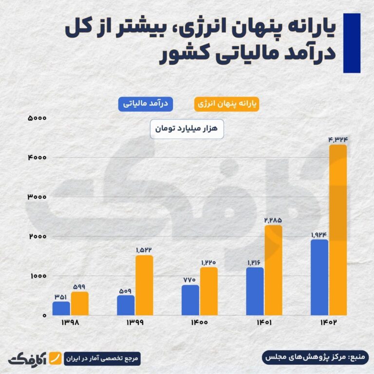 یارانه پنهان انرژی در کمتر از پنج سال از حدود ۶۰۰ هزار میلیارد تومان به بیش از ۴۳۰۰ هزار میلیارد تومان رسیده و از کل درآمد مالیاتی کشور هم جلو زده است.