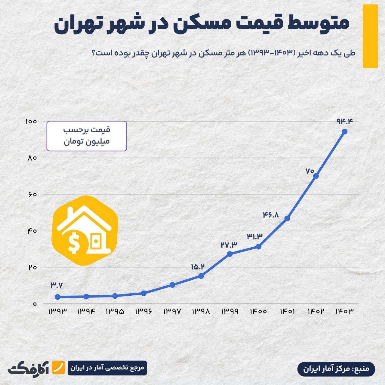 همچنین متوسط قیمت مسکن در شهر تهران حدود ۲۵.۵ برابر افزایش یافته و از متری ۳.۷ میلیون تومان در سال ۱۳۹۳ به ۹۴ میلیون تومان در سال ۱۴۰۳ رسیده است.