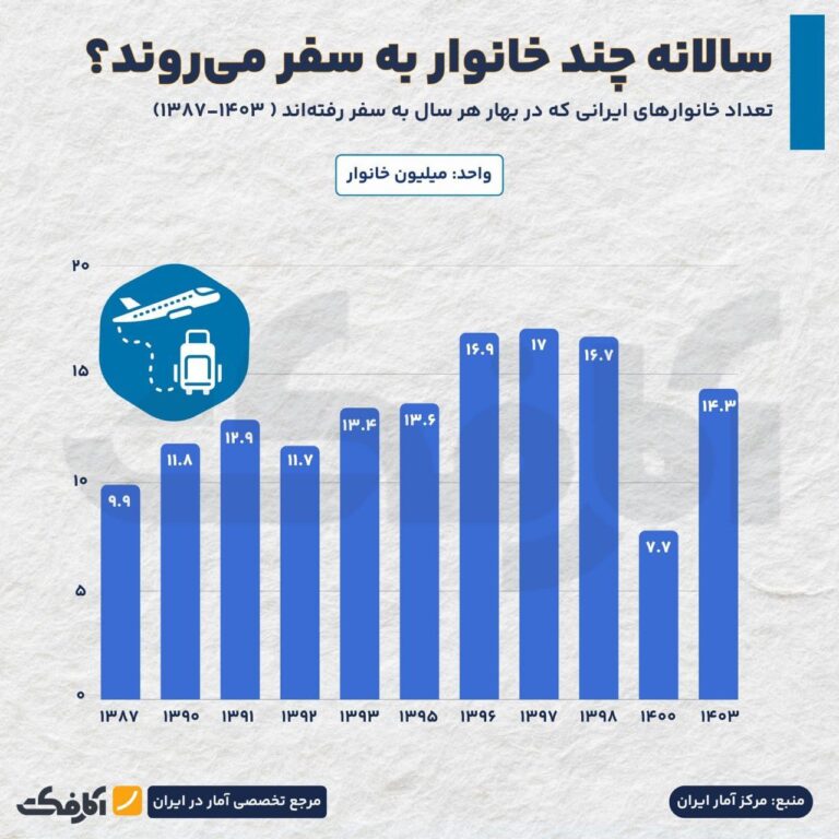 طی یک بازه ۱۶ ساله بیشترین تعداد خانوارهایی که در فصل بهار به سفر رفتهاند مربوط به سال ۱۳۹۷ با حدود ۱۷.۱ میلیون خانوار و کمترین مربوط به سال ۱۴۰۰ با تعداد ۷.۸ میلیون خانوار به ثبت رسیده است.