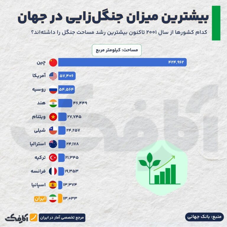 آمریکا، روسیه و هند پس از چین قرار دارند و ایران با ۱۳ هزار کیلومتر مربع افزایش، در رتبه یازدهم جهان ایستاده است.