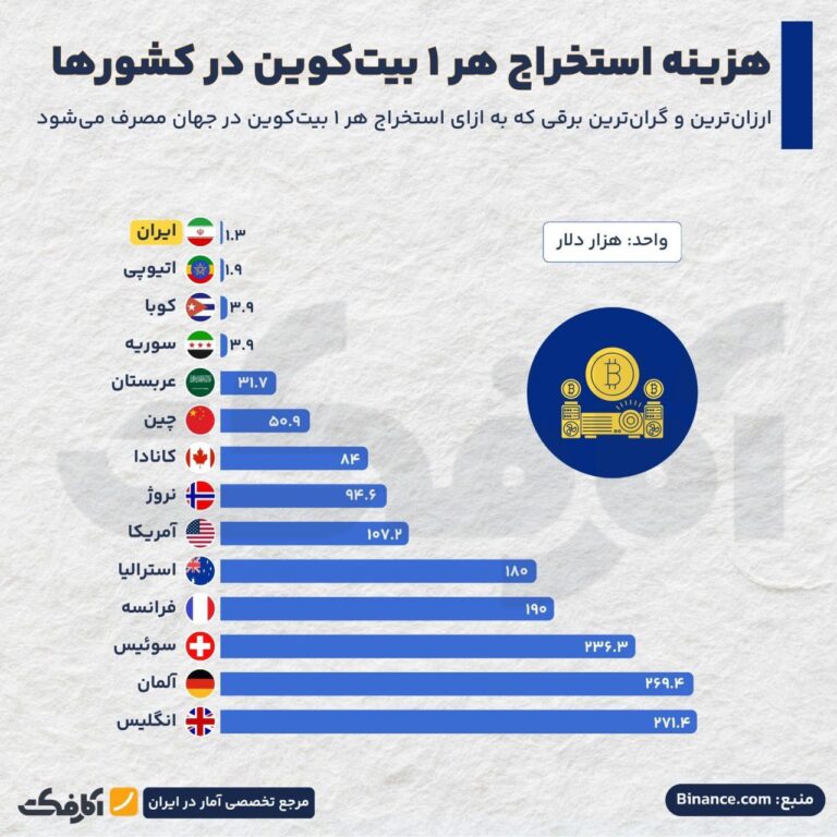 در مقابل، کشورهای اروپایی مانند انگلستان، آلمان و سوئیس با هزینههایی بیش از ۲۰۰ برابر ایران، در زمره گرانترین نقاط جهان برای استخراج بیتکوین قرار دارند؛ این موضوع ناشی از قیمت بالای برق و سیاستهای سختگیرانه انرژی در این کشورها است.