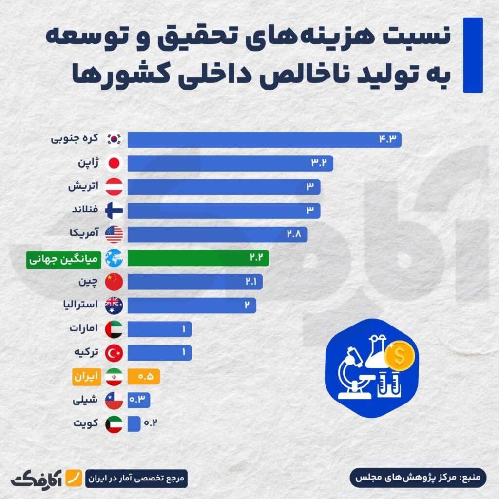 ایران حدود ۰.۵٪ از تولید ناخالص داخلی خود را صرف تحقیق و توسعه میکند، در حالی که میانگین جهانی ۲.۲٪ است.