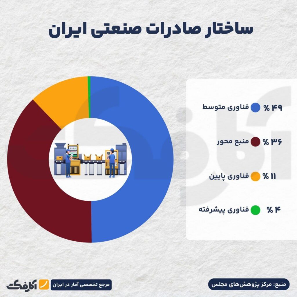 بیشتر صادرات صنعتی کشور مربوط به کالاهای با فناوری متوسط و منبعمحور است و فقط ۴٪ آن به فناوری پیشرفته اختصاص دارد.