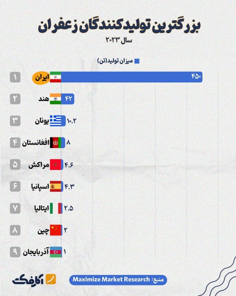 ایران با تولید ۴۵۰ تن زعفران در سال ۲۰۲۳ بزرگترین تولیدکننده زعفران در جهان است. کشور هند با تولید ۴۲ تن و یونان با ۱۰.۲ تن زعفران طی سال میلادی گذشته، در جایگاه دوم و سوم این آمار قرار دارند.