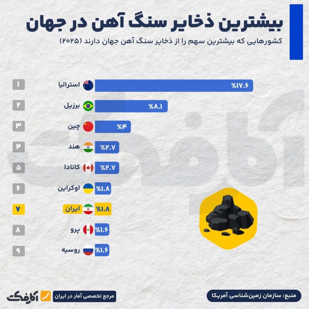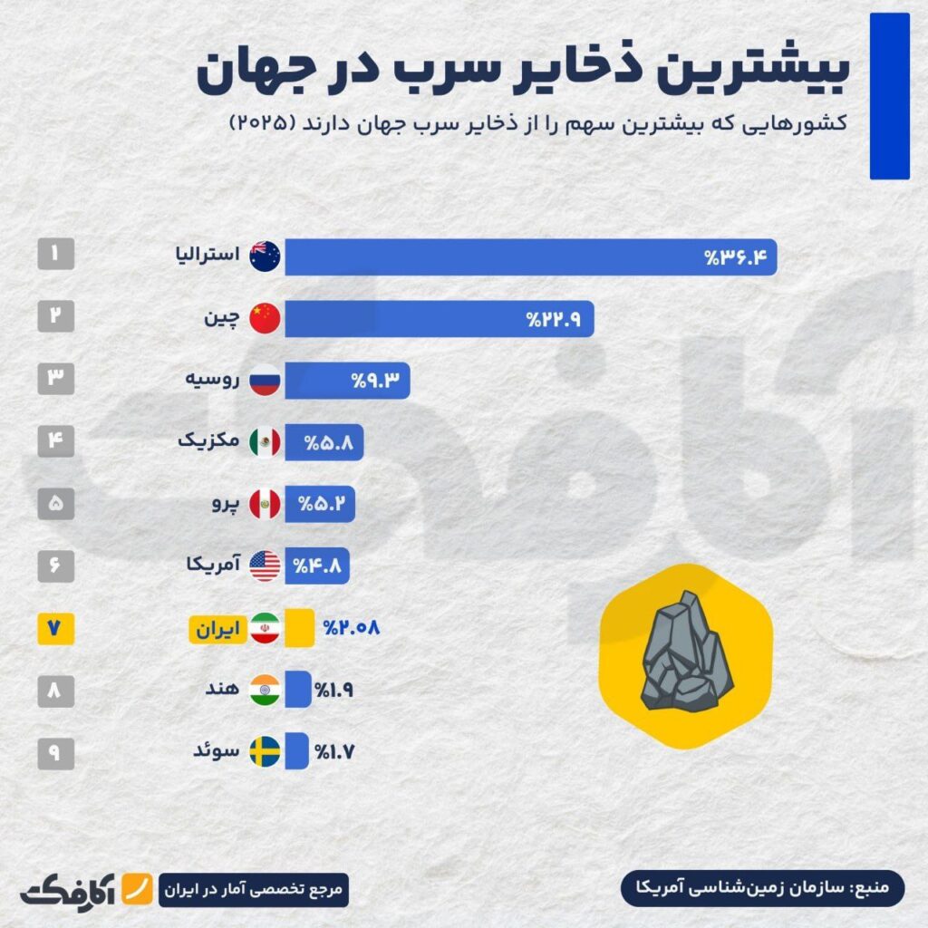 علاوه بر این، ایران در ذخایر سرب با ۲۰.۸ درصد سهم و در ذخایر سنگآهن با سهم ۱.۸ درصدی در رتبه هفتم جهان جای دارد.