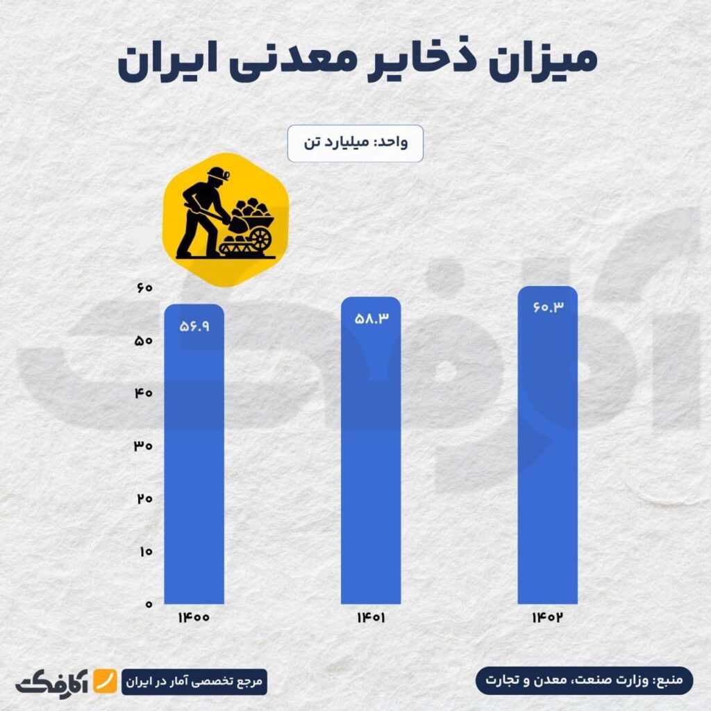 میزان کل ذخایر معدنی ایران تا سال ۲۰۲۲ حدود ۶۰.۳ میلیارد تن برآورد شده که پتانسیل بالایی برای توسعه اقتصادی و نقشآفرینی ایران در بازارهای جهانی مواد معدنی فراهم میکند.