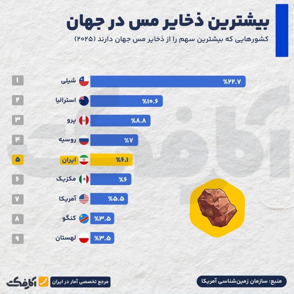 ایران ۶.۱ درصد از ذخایر مس جهان را در اختیار دارد و در رتبه پنجم جهان قرار دارد.
