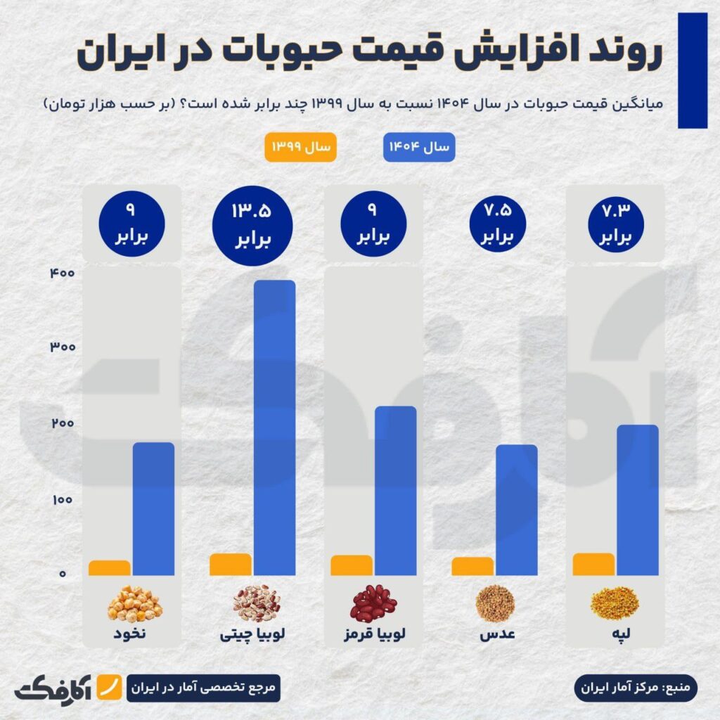 میانگین قیمت حبوبات در سال ۱۴۰۴ نسبت به ۱۳۹۹ بین ۷ تا ۱۳ برابر افزایش یافته است.