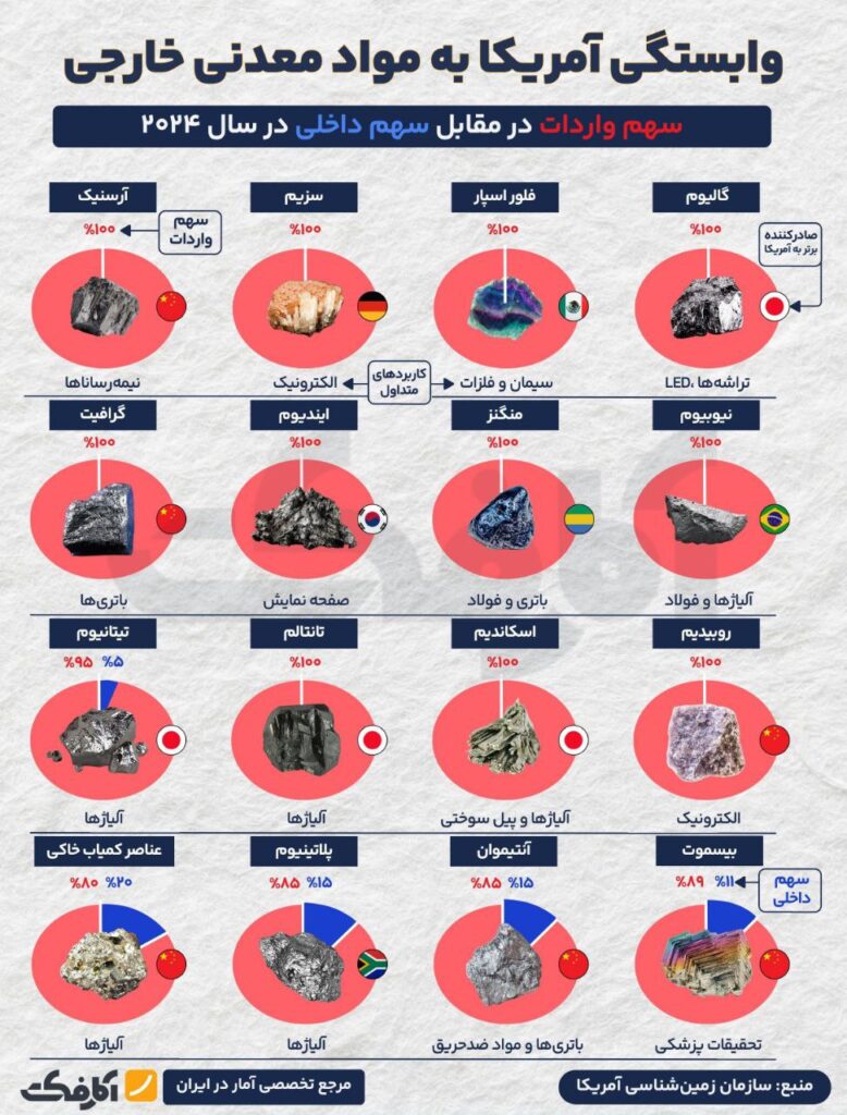 اقتصاد آمریکا بهشدت به واردات مواد معدنی کلیدی، بهویژه برای ۱۱ کالای معدنی که ۱۰۰٪ از خارج تأمین میشود، وابسته است.