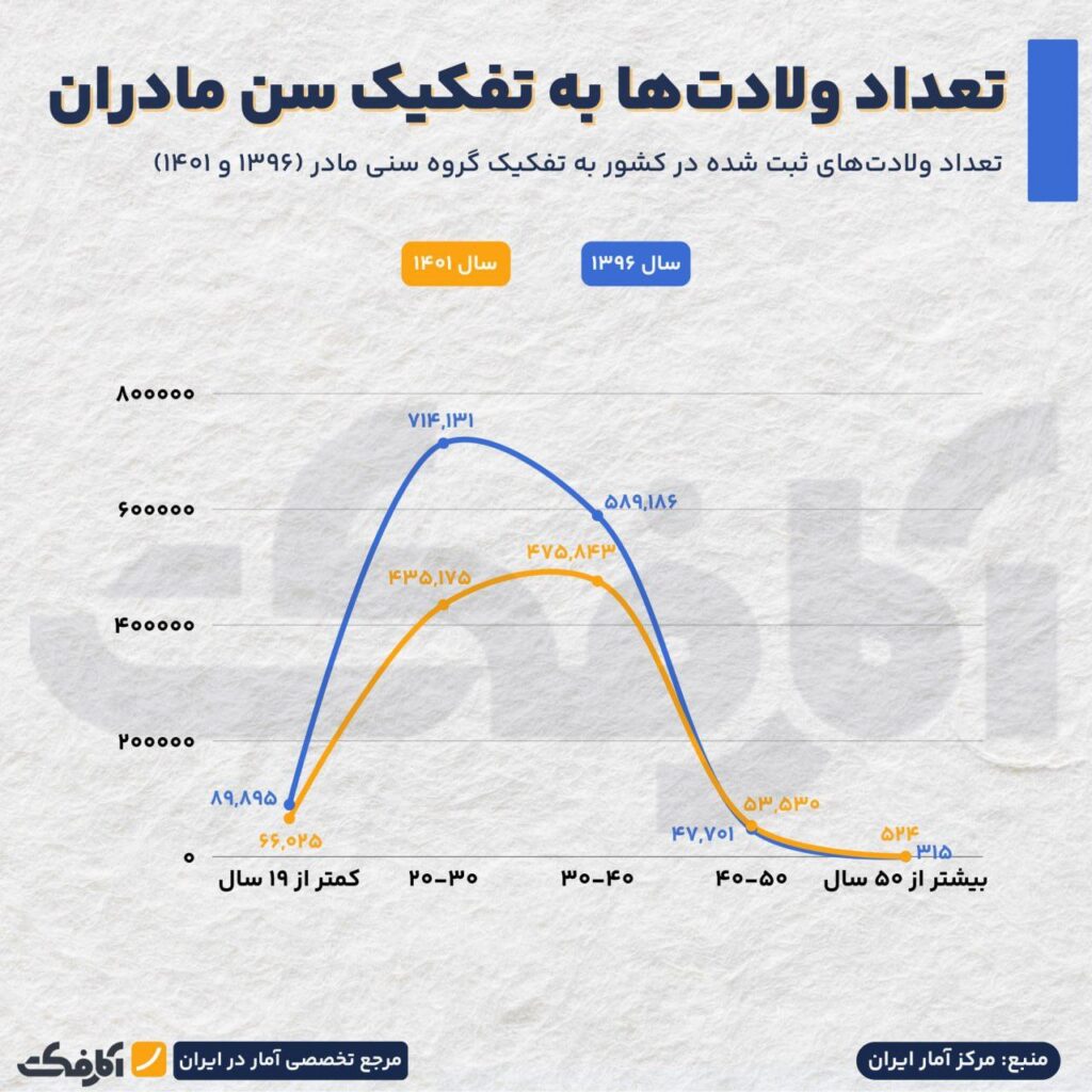 در مقابل، الگوی سنی مادران تغییر محسوسی داشته و بیشترین تولدها از گروه ۲۰ تا ۳۰ سال به گروه ۳۰ تا ۴۰ سال منتقل شده است. این موضوع نشان میدهد که فرزندآوری در میان زنان به سنین بالاتر انتقال یافته است.