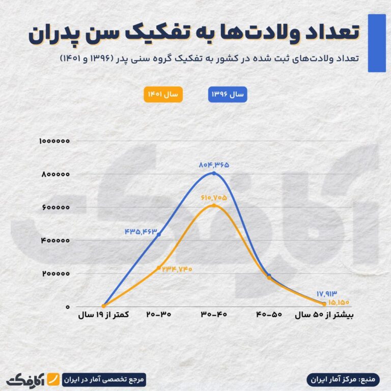 فاصله سنی مادر و فرزند در ایران افزایش یافت! در فاصله سالهای ۱۳۹۶ تا ۱۴۰۱، هرچند الگوی سنی پدران در زمان فرزندآوری ثابت مانده و همچنان بیشترین ولادتها مربوط به گروه ۳۰ تا ۴۰ سال است، اما تعداد ولادتها در همه گروههای سنی کاهش یافته است.