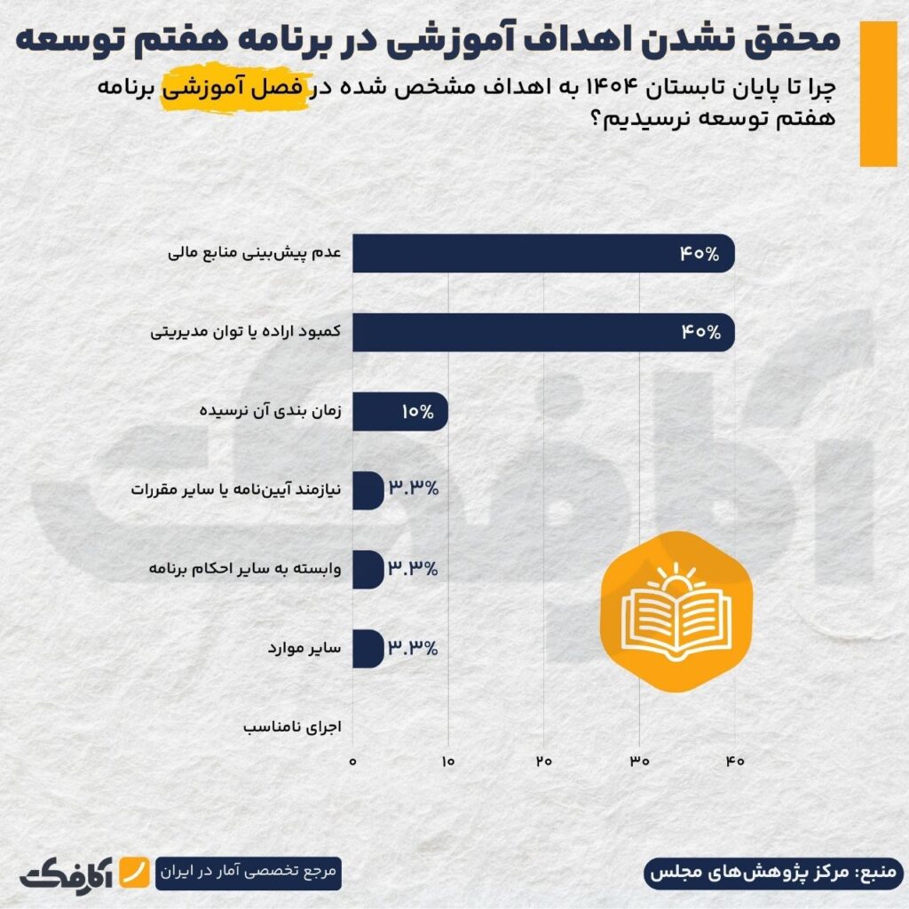 در فصل آموزش، «عدم پیشبینی منابع مالی» و «ضعف مدیریتی» هرکدام با سهم ۴۰٪ در صدر دلایل عدم تحقق قرار دارند.