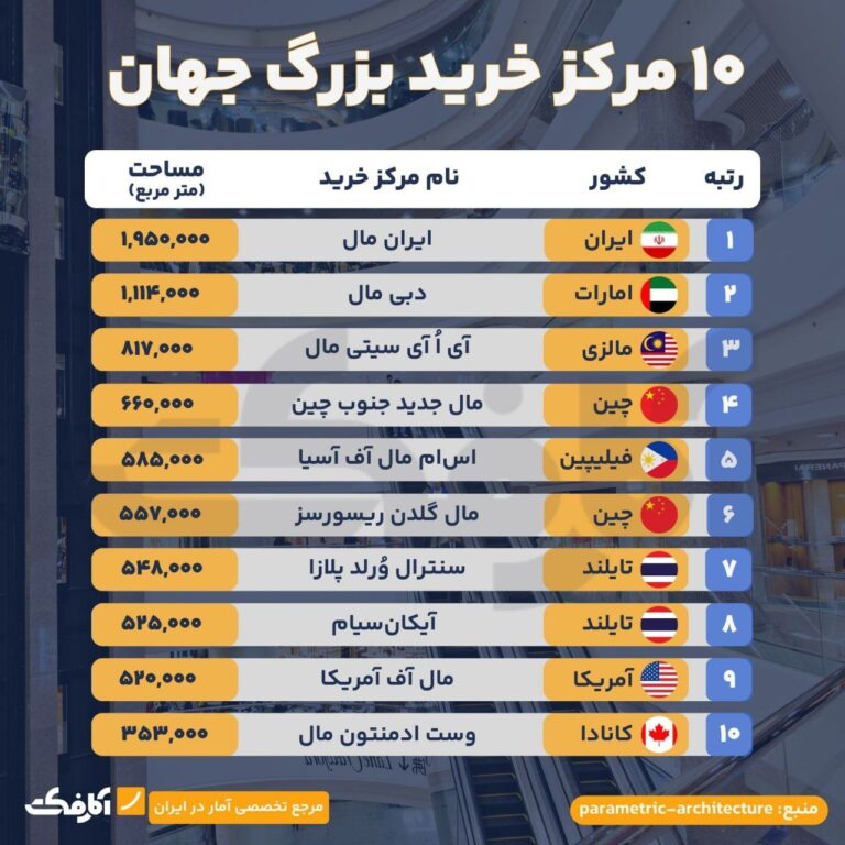 بزرگترین مرکز خرید جهان، ایران مال با مساحت ۱.۹ میلیون متر مربع در غرب تهران قرار دارد.